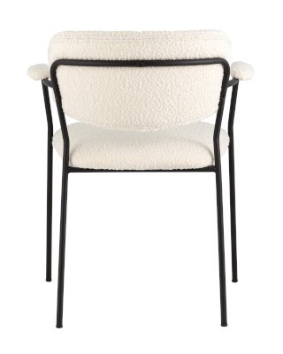 Современный обеденный стул с подлокотниками и металлическими ножками. Обивка выполнена из мягкой и легкой ткани букле. Красивый и очень мягкий материал, который оставляет ощущение теплоты и уюта. Металлический каркас черного цвета огибает спинку и плавно переходит из подлокотников в ножки. Широкое сиденье обеспечивает удобную посадку и уют. На подлокотниках для дополнительного комфорта предусмотрены мягкие накладки.