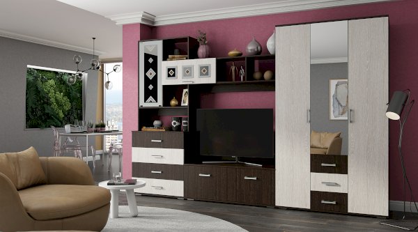 Модель имеет отделение с хромированной штангой для одежды на вешалках, три выдвижных ящика, а также зону с полками. На центральный фасад прикреплено высокое зеркало. Изделие выполнено из ЛДСП, дополнено эргономичными ручками.