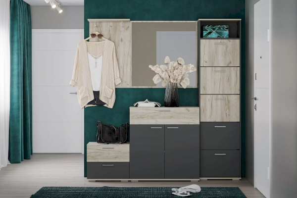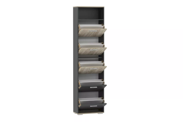 Тумба оснащена пятью ящиками для хранения обуви, которые открываются при их опускании благодаря специальному механизму, а лаконичные ручки серого цвета подчеркивают стиль коллекции. В верхней нише удобно расположить головные уборы или другие необходимые вещи. Дополните тумбу шкафом из одноименной коллекции, чтобы создать особо гармоничную атмосферу.