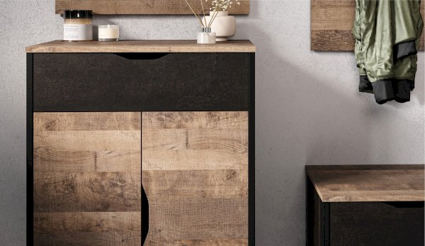 Функциональный вместительный комод станет отличным решением для оформления прихожей, спальни или гостиной. Особенность дизайна – это сочетание реалистичных по цвету и тактильности трендовых декоров, которые соответствуют последним городским тенденциям. «Дуб Гранж» привлекает имитацией вручную обработанного дерева и выразительной зернистой текстурой, характерной формой досок. Стильный серый цвет «Железного камня» с металлическими разводами и новая текстура состаренной штукатурки в сочетании с гладкостью металла вносят индустриальныи? колорит. Комод оснащен двумя ящиками на телескопических направляющих и закрытыми полками для хранения вещей и аксессуаров. Отсутствие лицевой фурнитуры подчеркивает минимализм и геометрию модуля. Идеально компонуется со всеми модулями системы Стокгольм.