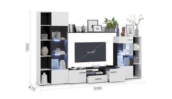 Современная стенка Невада – яркий представитель стиля минимализма, отличается высокой функциональностью и эстетичным внешним видом. Глянцевые белые фасады из МДФ и прозрачные витрины из закаленного стекла создают легкость и воздушность, а эффект блеска и отражения зрительно увеличивает пространство комнаты, добавляет света. Комбинированный контрастный корпус, ручки и задняя стенка черного цвета подчеркивают строгую геометрию линий и форм. Светодиодная подсветка делает акцент на дорогих для Вас вещах, таких как фото, статуэтки или посуда. Мебель выполнена из экологически безопасных и надежных материалов.