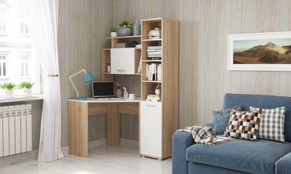 Стеллаж и пенал можно устанавливать как с левой, так и с правой стороны от углового стола, а также использовать как отдельный элемент.