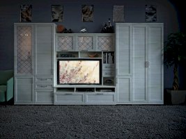 Витрина со стеклянной дверцей и боковиной, за которыми просматриваются полки и выставленные на них предметы. Стекло делает витрину визуально легкой, компактной, а всему помещению добавляет света и торжественности. Шкаф витрину можно использовать не только в сочетании с другими модулями гостиной, но и как отдельный предмет мебели.
