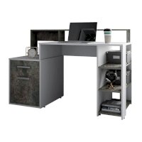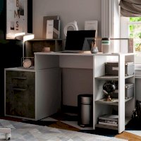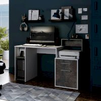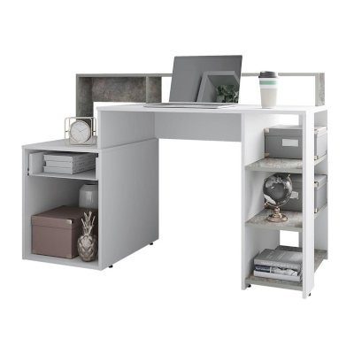 Компьютерный стол Лайф – это не просто стол, это полноценно оборудованное рабочее место. Модель состоит из вместительной столешницы, открытых и закрытых полок, а также небольшого выдвижного ящика для мелких вещей. Изделие выполнено из ЛДСП в сочетании цветов белый и метрополитан грей, оно прекрасно впишется в светлый современный интерьер.