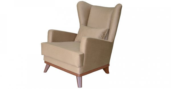 Высокая спинка с наклоном и мягкие подлокотники обеспечивают удобную посадку, дополнительный комфорт создает декоративная подушка. Царга кресла обтянута искусственной кожей в цвет опорам.