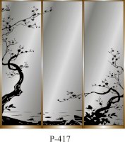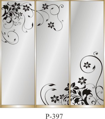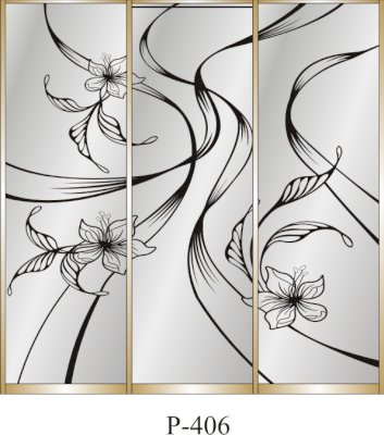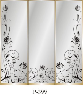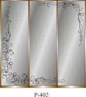 Данное изображение представлено в следующих цветах: корпус - Дуб Сонома, фасады - зеркало с пескоструйным рисунком, рамка двери и треки - Серебро матовое.