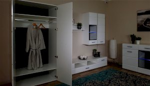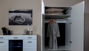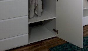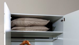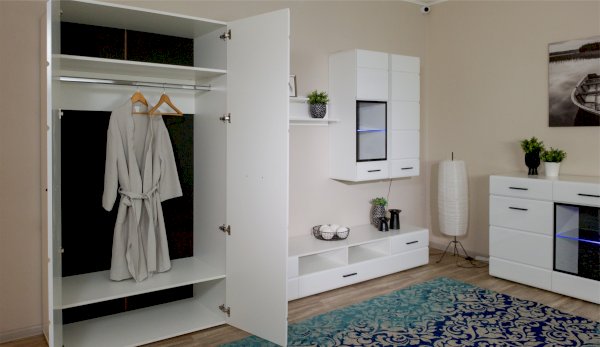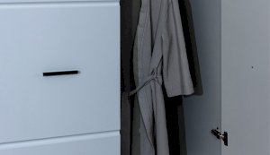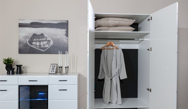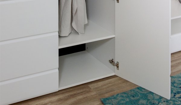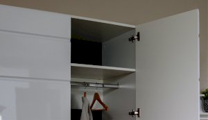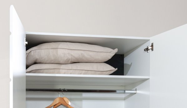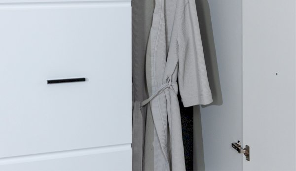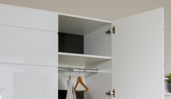 Компактный шкаф Йорк – это решение для небольшой спальни, гостиной или прихожей. Он выполнен в современном стиле – сочетает в себе функциональность и эффектный внешний вид: горизонтальная фрезеровка фасадов, контрастные черного цвета ручки и задняя стенка из ХДФ. Глянцевые белые фасады High Gloss из МДФ наполняют помещение светом, делают его воздушнее. Внутри предусмотрены секции для белья и отделение со штангой. Идеально компонуется со всеми модулями системы Йорк.