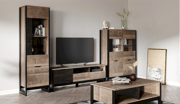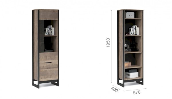 Шкаф-витрина со стеклянным фасадом – современное решение для гостиной или прихожей в стилях лофт, сканди, эко-минимализм. За стеклом размещены полки для предметов интерьера или красивой посуды. Нижнее отделение с глухим фасадом служит для хранения личных вещей. Отсутствие лицевой фурнитуры подчеркивает минимализм и геометрию модуля. Особенность дизайна – это сочетание реалистичных по цвету и тактильности трендовых декоров, которые соответствуют последним городским тенденциям. «Дуб Гранж» привлекает имитацией вручную обработанного дерева и выразительной зернистой текстурой, характерной формой досок. Стильный серый цвет «Железного камня» с металлическими разводами и новая текстура состаренной штукатурки в сочетании с гладкостью металла вносят индустриальныи? колорит. Оригинальные ножки-опоры из МДФ контрастного цвета придают изюминку, а светодиодная подсветка усилит впечатление от созданного интерьера.