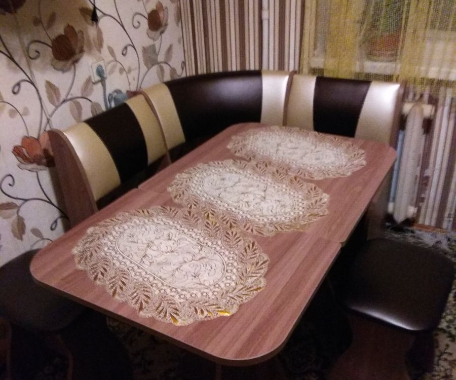 Кухонный стол со складной половиной столешницы в цвет корпуса углового кухонного дивана.