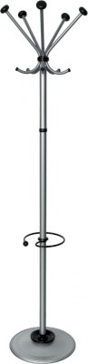 Вешалка напольная на 5 крючков. Снабжена подставкой для зонтов. Утяжеленное двойное основание. Выполнена из оцинкованной стали с полимерным покрытием. Декоративные наконечники (шары) – натуральное дерево