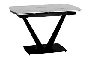 Лаконичный обеденный стол Клео с рисунком белого мрамора. Столешница из керамики отличный вариант для кухни. Материал знаменит прочностью и долговечностью, поверхность устойчива к различным внешним воздействиям. Компактный размер позволяет экономить пространство. Благодаря спрятанным по бокам элементам можно увеличить полезную площадь стола до 30 или 60 см. Металлический каркас черного цвета гармонично сочетается с цветом столешницы. Ножки V-формы надежно удерживают всю конструкцию. Основание каркаса оснащено заглушками, которые не позволяют металлическим частям соприкасаться с полом и портить покрытие при перемещении.