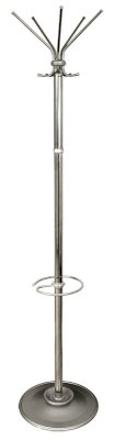 Вешалка напольная на 5 крючков. Утяжеленное двойное основание. Оснащена подставкой для зонтов. Крючки и основание вешалки напольной выполнены из серого металлика.