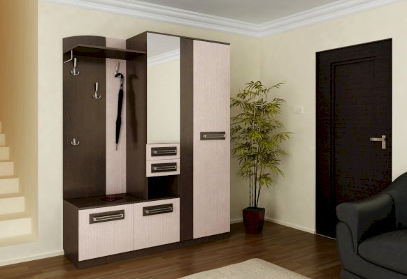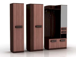 Отличительные особенности прихожей — функциональный дизайн и современные оттенки текстур. Конструкция данной модели включает в себя все необходимое: зеркало, шкаф, пенал, вешалки, ящики и множество полок для различных мелочей.