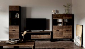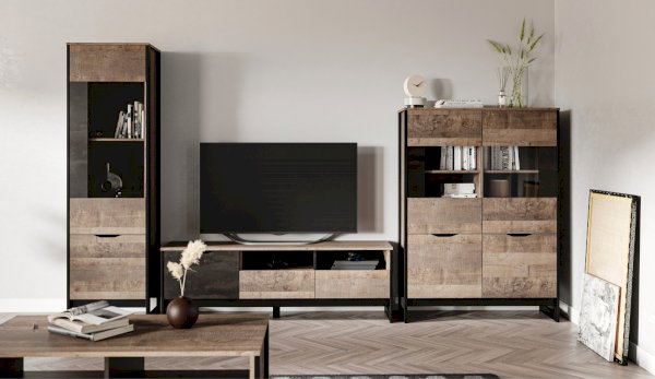 Шкаф-витрина со стеклянным фасадом – современное решение для гостиной или прихожей в стилях лофт, сканди, эко-минимализм. За стеклом размещены полки для предметов интерьера или красивой посуды. Нижние отделения с глухими фасадами служат для хранения личных вещей. Отсутствие лицевой фурнитуры подчеркивает минимализм и геометрию модуля. Особенность дизайна – это сочетание реалистичных по цвету и тактильности трендовых декоров, которые соответствуют последним городским тенденциям. «Дуб Гранж» привлекает имитацией вручную обработанного дерева и выразительной зернистой текстурой, характерной формой досок. Стильный серый цвет «Железного камня» с металлическими разводами и новая текстура состаренной штукатурки в сочетании с гладкостью металла вносят индустриальный колорит. Оригинальные ножки-опоры из МДФ контрастного цвета придают изюминку, а светодиодная подсветка усилит впечатление от созданного интерьера.