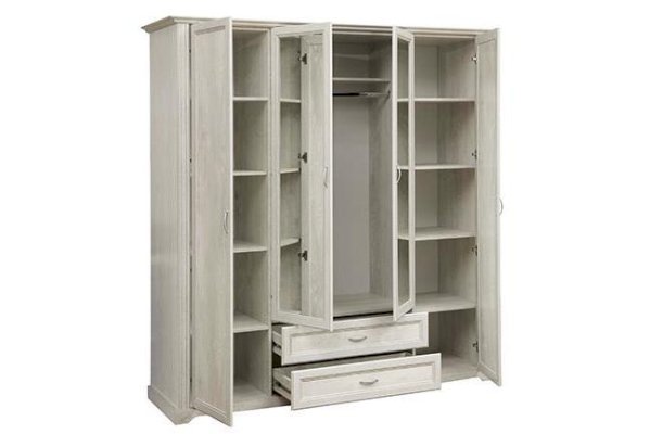 Данная модель – настоящая мини-гардеробная и отличная альтернатива целой комнате, ведь в нем поместится вся ваша одежда – и не только! Все в нем учтено до мелочей. Распашные двери – две глухие по краям и две зеркальные в центре – удобны и практичны. Внутреннее пространство продумано и зонировано. По краям, справа и слева расположились полки, на которых можно разместить одежду, а также коробки-боксы с вещами или обувью. В каждом отсеке находится по 5 полок, что оптимально по высоте: четыре полки в свободной зоне доступа даже для человека с маленьким ростом, а пятая, верхняя – для тех, кто повыше. Так что, если вы обладаете высоким ростом, у вас есть явные преимущества – это будет только ваше пространство! Каждая полка выдерживает до 5 кг – это достаточно для большого количества вещей. Глухие двери скроют от посторонних глаз то, что для них не предназначено. Центральные дверцы шкафа – зеркальные, это избавляет владельцев шкафа приобретать отдельное зеркало. Наверху расположена удобная горизонтальная полка, которая служит в качестве антресоли, куда можно убрать сезонные вещи, либо предметы, которыми хозяева пользуются не так часто. Центральный отсек снабжен металлической штангой, которая выдерживает вес до 20 кг, и предназначен для одежды на вешалках. Можно надеть любимое платье или костюм, закрыть шкаф и тут же оценить себя в зеркале. Очень удобно! Два выдвижных ящика под центральным отсеком подойдут как для вещей, так и для обуви – это зависит от помещения, где расположен шкаф. Если он находится в спальне, то в ящиках можно разместить белье – один отсек для НЕЕ, другой – для НЕГО, а если в холле или в прихожей, то в ящиках поместится обувь всей семьи. Благодаря современным технологиям дверцам и выдвижным ящикам не нужны доводчики – они легко и дружелюбно распахиваются и выдвигаются навстречу  по первому желанию хозяев. Шариковые направляющие обеспечивают очень плавный ход. Дверцы и ящики снабжены металлическими ручками, которые учитывают анатомию ладони, поэтому ими очень удобно пользоваться.