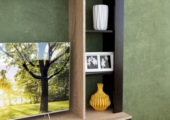 Гостиная Торонто - оригинальный дизайн, вместительность и небольшие габариты. Занимая мало места по глубине и ширине, она включает в себя платяной шкаф с штангой, нишу под ТВ и множество полок для приставок, колонок, книг и декора. Использование популярных цветов Дуб сонома и венге даёт возможность легко сочетать эту стенку в гостиной с другими предметами мебели – столами, журнальными столиками, стеллажами или комодами. Выполнена из экологичных материалов.